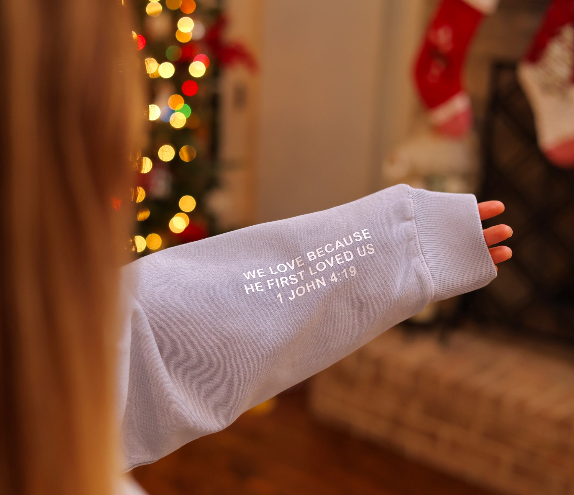 1 John 4:19 printed on the sleeve: "We love because He first loved us."